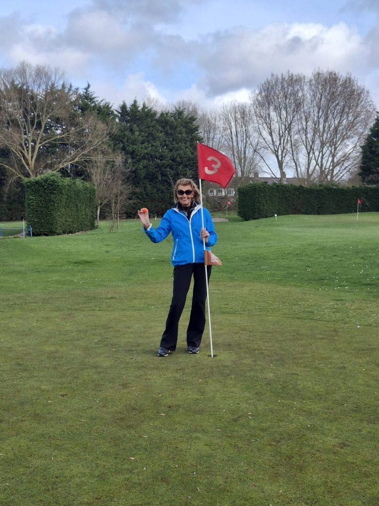 Wat was het geval?  Rita van der Krogt sloeg haar eerste bal van de wedstrijd af, volgde hem, verloor hem uit het oog door het felle tegenlicht van de zon, ging op zoek en vond hem in de cup op de green van hole 3!!